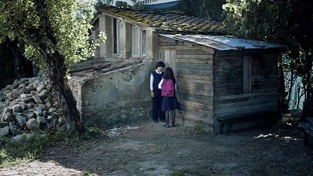 Mia and Vincent outside Vincent's shack.